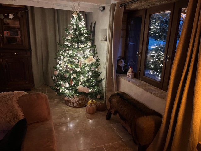 Omdat Peter tijdens de "echte" Kerstdagen in Nederland is vieren wij 15 en 16 december Kerst in Le Puech. De aankleding van het huis was natuurlijk al ruim voor Kerst klaar dus de Kerstsfeer was al voldoende aanwezig. Het kerstdiner is kaasfondeau. De we hebben ons op z'n kerstbest aangekleed en de tafel is mooi gedekt. De eerste Kerst sinds we hier wonen.