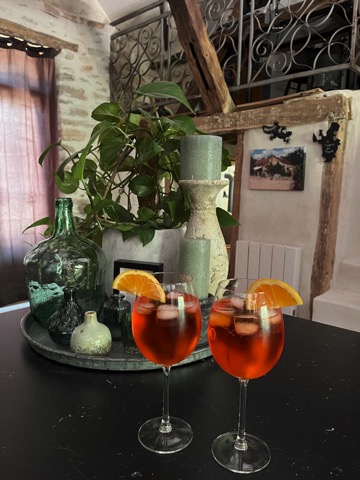 Een welkomsdrankje mag natuurlijk niet ontbreken. Vorige week bracht Marina ons op een goed idee door een Aperol Spritz te nemen. Lekker spul, drinkt als limonade :). Gelijk maar een literfels gekocht met een paar flessen "Franse" prosecco. Thijs stort zich op een berg stenen om een hondenverblijf voor Smokey te maken, geheel in de lokale stijl en techniek terwijl genieten van elkaars gezelschap.
